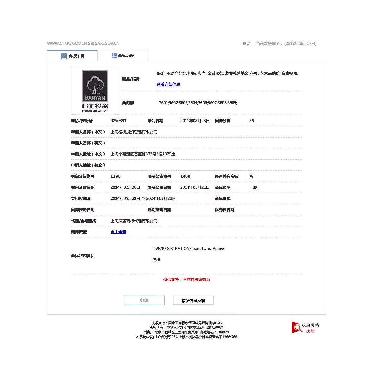 商標(biāo)注冊(cè)證核定使用商品:保險(xiǎn); 不動(dòng)產(chǎn)經(jīng)紀(jì); 擔(dān)保; 典當(dāng); 金融服務(wù); 募集慈善基金; 信托; 藝術(shù)品估價(jià); 資本投資。